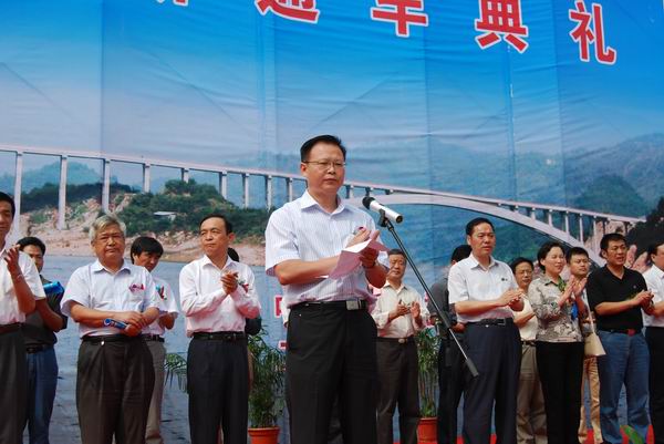 10時28分典禮正式舉行,來自兩岸的數(shù)千名群眾見證了這一激動人心的時刻。省交通運輸廳廳長梅勁、省公路局局長秦勤、省公路學(xué)會理事長李永鐸、六安市副市長楊光祥、金寨縣委書記沙洪虎、縣長夏倫平和四大班子成員、金寨縣各個鄉(xiāng)鎮(zhèn)主要負(fù)責(zé)人等領(lǐng)導(dǎo)出席了通車典禮。典禮由金寨縣委副書記、縣長夏倫平主持。來自我公司代表、金寨縣各單位代表共同組織了八個方陣參加了典禮。公司總經(jīng)理汪衛(wèi)東應(yīng)邀出席典禮,并參加了剪彩儀式。