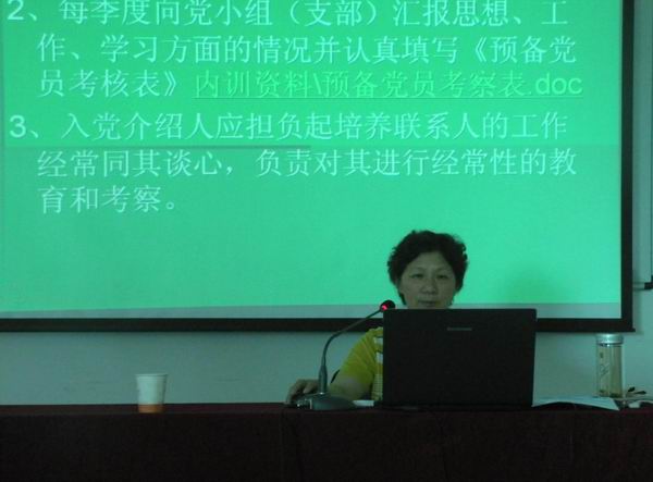 黨委辦公室主任劉昀主持了培訓(xùn)會(huì),并就發(fā)展黨員工作程序,作了專題講座。劉主任通過(guò)PPT課件,系統(tǒng)的介紹了黨員發(fā)展程序,從制訂發(fā)展黨員的工作計(jì)劃開始,到預(yù)備黨員轉(zhuǎn)正、整個(gè)入黨材料存入個(gè)人檔案,以及最后的責(zé)任追究都作了詳細(xì)介紹,讓與會(huì)人員對(duì)發(fā)展黨員工作的程序有了清楚的了解。隨后,大家一起觀看了《欲之害——段義和腐敗案件警示錄》。專題片揭露了段義和利用職務(wù)便利大肆索賄的腐敗行徑,深刻揭示了腐化墮落的思想根源和蛻變軌跡。通過(guò)觀看警示教育片,使大家接受了一次深刻的思想教育和精神洗禮,進(jìn)一步認(rèn)識(shí)了在新形式下反腐倡廉建設(shè)的重要性。