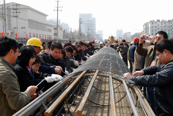 項(xiàng)目辦負(fù)責(zé)人向?qū)W員們簡單介紹了工程概況。學(xué)員們在工人師傅的指導(dǎo)下,紛紛戴上手套、拿起工具,給已成型的樁基鋼筋籠綁扎鋼絲,親身體驗(yàn)了建設(shè)者的辛勞。學(xué)員們虛心向工人師傅學(xué)習(xí),緊圍著鋼筋籠,一邊認(rèn)真扎絲,一邊相互交流,探討綁扎技巧。在學(xué)員們的巧手下,兩個(gè)鋼筋籠很快完成綁扎,將用于晚間施工。