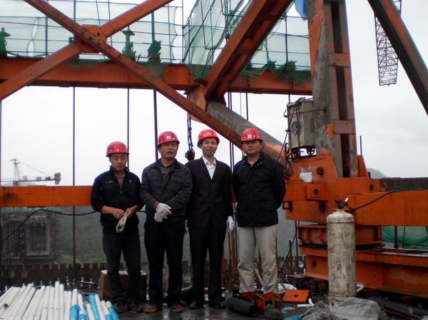 31日上午,在經(jīng)過(guò)整夜大雨后,天空依舊飄散著涼涼的細(xì)雨。盛總一行在項(xiàng)目總工胡學(xué)祥和項(xiàng)目副經(jīng)理張林的陪同下,對(duì)巖子腳大橋進(jìn)行了認(rèn)真的檢查,并冒雨登上高達(dá)74米的4號(hào)主墩施工現(xiàn)場(chǎng)。他就進(jìn)行到掛藍(lán)施工階段的大橋與項(xiàng)目人員展開(kāi)討論,對(duì)施工現(xiàn)場(chǎng)存在的施工難點(diǎn)和注意事項(xiàng)一一指出。盛總對(duì)項(xiàng)目部克服種種困難加緊施工作出了肯定。