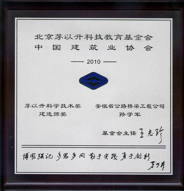 孫學(xué)軍主持建設(shè)了安徽省南照淮河大橋、沿江高速、廬銅高速、銅湯高速、合肥市徽州大道等工程項目,所建項目榮獲了國家優(yōu)質(zhì)獎“魯班獎”、省優(yōu)“黃山杯”等獎項,并獲省交通廳“優(yōu)秀施工單位”、合肥市委市政府“大建設(shè)先進集體”等榮譽。此外,他個人榮獲全國優(yōu)秀建造師、“魯班獎”工程優(yōu)秀項目經(jīng)理、“黃山杯”工程優(yōu)秀項目經(jīng)理等榮譽。