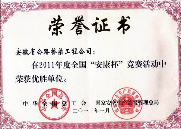近日,公司喜獲全國(guó)“安康杯”競(jìng)賽優(yōu)勝單位稱號(hào)。