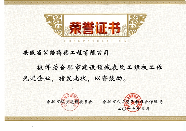公司榮獲“合肥市建設(shè)領(lǐng)域農(nóng)民工維權(quán)工作先進企業(yè)” 稱號 發(fā)布時間:2017年04月27日 來源:市政分公司 發(fā)布人: 作者:董丁祥 瀏覽:2857次 近日,合肥市城鄉(xiāng)建設(shè)委員會、人力資源和社會保障局表彰了在建設(shè)領(lǐng)域農(nóng)民工維權(quán)工作中表現(xiàn)突出的單位,公司榮獲“合肥市建設(shè)領(lǐng)域農(nóng)民工維權(quán)工作先進企業(yè)” 稱號。