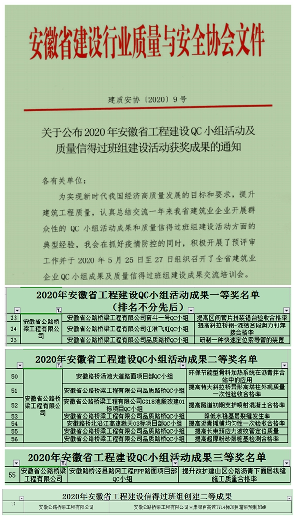 6月4日,安徽省建筑質(zhì)量與安全協(xié)會公布了2020年安徽省工程建設(shè)QC小組活動及質(zhì)量信得過班組建設(shè)活動獲獎成果名單。公司QC小組申報(bào)的《提高區(qū)間管片拼裝錯(cuò)臺驗(yàn)收合格率》等3項(xiàng)成果榮獲一等獎,《環(huán)保節(jié)能型骨料加熱系統(tǒng)在瀝青拌合站中的應(yīng)用》等7項(xiàng)成果榮獲二等獎,《提升改擴(kuò)建山區(qū)公路瀝青下面層縱縫施工質(zhì)量合格率》榮獲三等獎。同時(shí),甘肅銀百高速TY14標(biāo)項(xiàng)目箱梁預(yù)制班組榮獲安徽省工程建設(shè)信得過班組創(chuàng)建二等成果。
