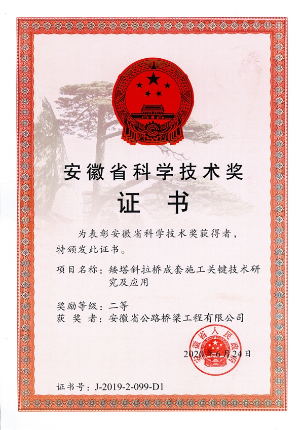 近期,公司主持申報的《矮塔斜拉橋成套施工關鍵技術研究及應用》課題,通過層層篩選,榮獲“2019年度安徽省科學技術獎二等獎”。