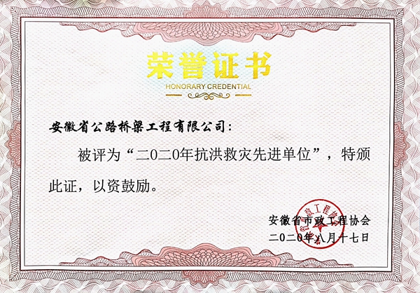 公司榮獲安徽省市政工程協(xié)會(huì)“2020年抗洪救災(zāi)先進(jìn)單位”