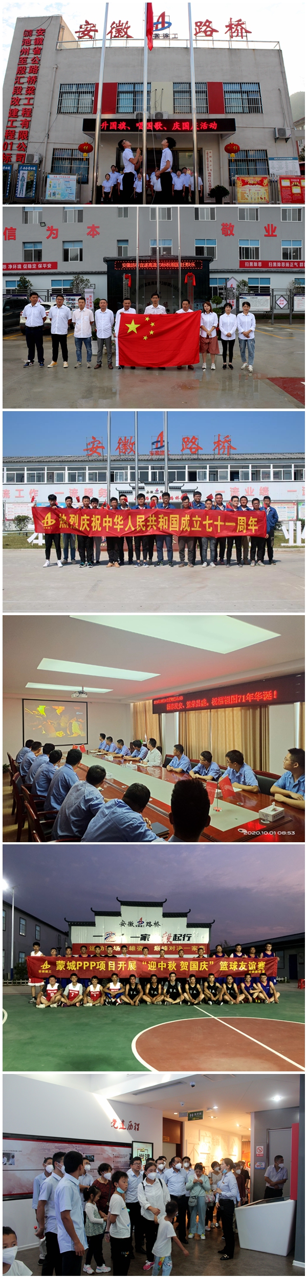 國慶前夕,市政分公司開展“學習強國·一站到底”迎中秋慶國慶知識競賽,以賽學史,吸引了來自十多個項目青年員工的積極參與。國慶當日,福建漳州項目、陜西合陽項目、江西宜遂高速P3標、河南黃河特大橋項目、固蚌02標、徽州大道等省內(nèi)外重點項目共同舉行“升國旗、唱國歌、慶國慶”主題活動,表達對祖國母親的祝福之情。明巢高速05標、合肥軌道4號線01標等項目黨支部組織全體員工集中觀看《我和我的祖國》《建國大業(yè)》《八佰》等愛國題材電影。鳳陽ppp項目、廬江片區(qū)項目組織員工就近參觀愛國主題教育基地,接受一次深刻的理想信念和愛國主義教育。此外,池州G318改建工程、蒙城PPP、蕪黃高速等項目還結(jié)合“家文化”建設,邀請職工家屬到項目部共慶佳節(jié)。