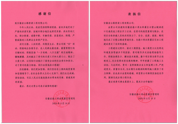 近日,由安徽路橋公司承建的宣城市寧國港口灣水庫灌區(qū)石壁山隧道進口交通改造工程獲安徽省港口灣水庫灌區(qū)管理局來信感謝,對公司在入汛時發(fā)揮國企擔(dān)當(dāng)、積極抗洪搶險,安全、優(yōu)質(zhì)、高效完成石壁山隧道進口交通改造任務(wù)表示感謝。