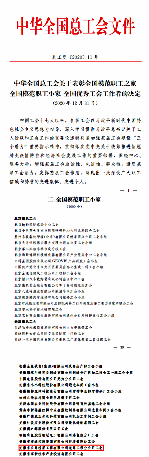 近日,中華全國總工會印發(fā)《中華全國總工會關(guān)于表彰全國模范職工之家全國模范職工小家全國優(yōu)秀工會工作者的決定》,道路分公司入選“全國模范職工小家”榮譽(yù)稱號,為公司工會工作注入新的成色。