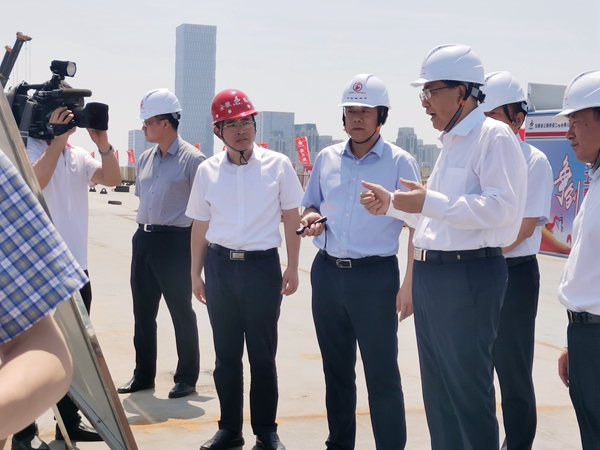 在項目主線橋鋼箱梁施工現(xiàn)場,李錦斌聽取了公司黨委書記、董事長錢申春關(guān)于項目概況、施工工藝和施工進度的匯報,仔細(xì)詢問了項目風(fēng)險隱患識別、風(fēng)險防范舉措、如何保障安全施工等工作開展情況,對項目的安全生產(chǎn)工作表示肯定。李錦斌再三叮囑,要堅持綜合管控、分類治理、壓實責(zé)任、全面覆蓋,做到排查精準(zhǔn)、管理精細(xì)、措施精當(dāng),有效化解各類安全生產(chǎn)風(fēng)險,真正實現(xiàn)技術(shù)過關(guān)、施工過關(guān)、質(zhì)量過關(guān)、安全過關(guān)。