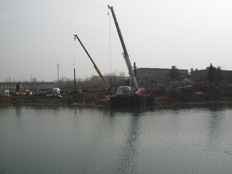 淠望路大橋作為市政工程具有工期緊、任務(wù)重、技術(shù)難度大的特點(diǎn),但經(jīng)項(xiàng)目部領(lǐng)導(dǎo)精心組織、科學(xué)部署,加大人力與設(shè)備的投入,自2月1日進(jìn)場(chǎng)開(kāi)工以來(lái),全部90根挖孔樁已開(kāi)挖41根,累計(jì)深度270m;于2月18日開(kāi)始進(jìn)行關(guān)鍵工序——主墩右幅鋼板樁圍堰施工。由于淠史杭干渠承擔(dān)皖豫兩省14個(gè)縣(區(qū))的春耕灌溉任務(wù),六安市重點(diǎn)辦要求加快施工進(jìn)度,必須在4月15日完成所有水下工程及用于水面以上施工的支撐等,并于4月25日前完成圍堰拆除清理工作。項(xiàng)目部立即召開(kāi)緊急動(dòng)員會(huì),號(hào)召全體技術(shù)人員克服一切困難和挑戰(zhàn),堅(jiān)決完成上級(jí)交代的任務(wù),并立即組織技術(shù)人員根據(jù)鋼板樁長(zhǎng)度、水深、地質(zhì)、承臺(tái)埋置深度等情況,制定了科學(xué)的施工技術(shù)方案、成立了以項(xiàng)目部經(jīng)理、副經(jīng)理為組長(zhǎng)的安全領(lǐng)導(dǎo)小組。施工所用的T90振動(dòng)錘、70t吊車、25t吊車、PC200挖機(jī)、 T100推土機(jī)、ZLM50裝載機(jī)、自卸車等重型機(jī)械設(shè)備陸續(xù)開(kāi)進(jìn)施工現(xiàn)場(chǎng)。