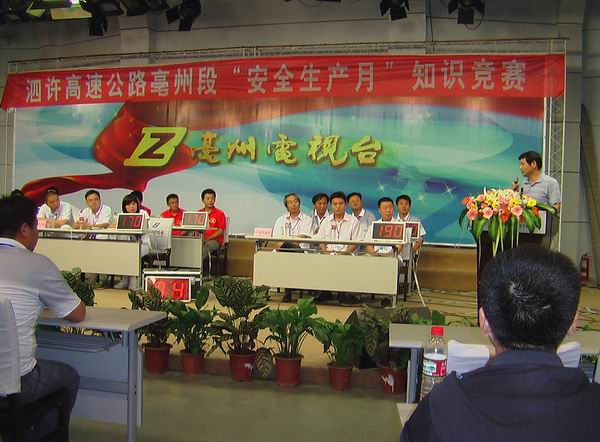 6月12日下午,在亳州市電視臺(tái)七樓演播廳舉辦了泗許高速亳州段“安全生產(chǎn)月”知識(shí)競(jìng)賽,此次競(jìng)賽由泗許高速亳州段建設(shè)辦舉辦,監(jiān)理單位和各施工單位共六支隊(duì)伍參加了比賽。亳州市質(zhì)量安全監(jiān)督局副局長(zhǎng)程權(quán),泗許高速亳州段建設(shè)辦工程部部長(zhǎng)蔡兵出席競(jìng)賽并擔(dān)任競(jìng)賽評(píng)委。