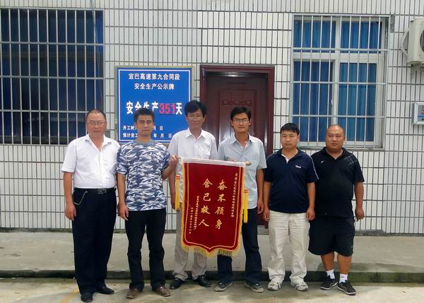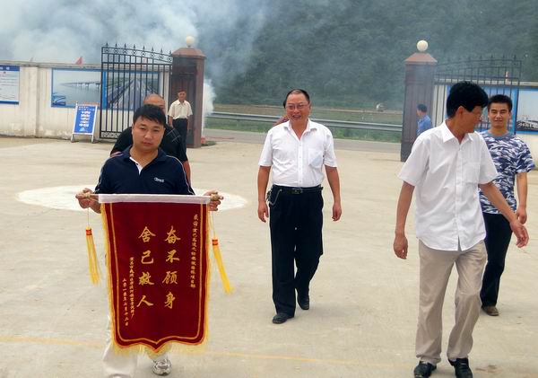 為感謝救人宜昌汽修廠送錦旗到宜巴09標 發(fā)布時間:2010年07月20日 來源:宜巴09標 發(fā)布人: 作者:晏永超 瀏覽:4460次 7月15日,公司宜巴09標項目部禮炮聲隆隆,喜氣洋洋。宜昌市夷陵區(qū)霧渡河鎮(zhèn)富貴汽修廠為感謝公司員工奮不顧身搶救落水人員特送來錦旗,錦旗上寫著“奮不顧身,舍己救人”。 6月26日,福貴汽修廠員工駕車經(jīng)過我項目二工區(qū)馬家河二號橋附近時,突然沖入河中,我部員工王雪松、韋祥峰等見此情景,奮不顧身跳河救人,同時項目部積極調(diào)配車輛設備,奮力施救,經(jīng)過一個小時的救援,駕駛員獲救。夷陵區(qū)電視臺對此進行報道,引起了強烈的社會反響。 王雪松、韋祥峰等人在接受夷陵區(qū)光電中心記者采訪時謙虛的說,面對危險,任何人都會主動施救,我們只是做了安徽路橋人應該做的事情。一個人就是一面旗子,王雪松、韋祥峰等就是安徽路橋的一面旗子,飄揚在宜巴高速路上。