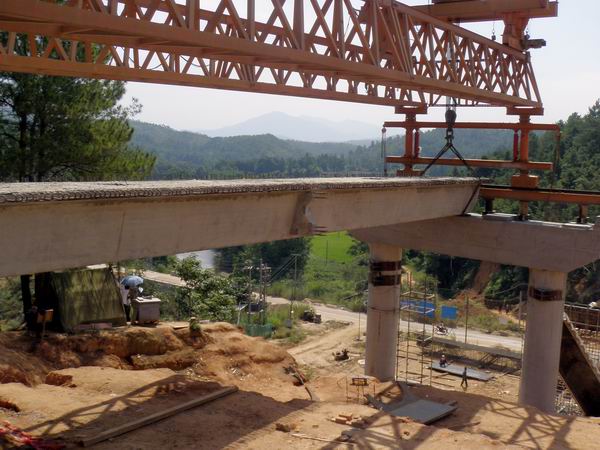為了確保架梁工作的順利開(kāi)展,項(xiàng)目部領(lǐng)導(dǎo)到現(xiàn)場(chǎng)指導(dǎo)架橋機(jī)的拼裝、檢驗(yàn)等工作,通過(guò)對(duì)架梁人員進(jìn)行分部分項(xiàng)技術(shù)交底,讓所有現(xiàn)場(chǎng)作業(yè)人員都能做到熟捻于心。經(jīng)過(guò)施工人員精心施工,努力奮斗,于10月2日完成架橋機(jī)拼裝,10月3日完成調(diào)試。10月5日,在項(xiàng)目部領(lǐng)導(dǎo)、監(jiān)理和駐地辦領(lǐng)導(dǎo)的共同指揮下,我標(biāo)段首片箱梁成功架設(shè)?,F(xiàn)場(chǎng)鞭炮齊鳴,掌聲如雷,為國(guó)慶增添新的喜慶。