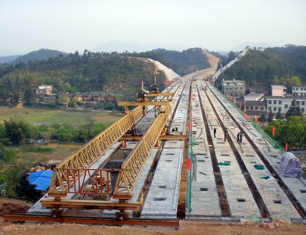 站塘大橋的中心樁號(hào)為K1497+532,全長(zhǎng)306米,共12跨,是我標(biāo)段最長(zhǎng)的一座大橋。上部構(gòu)造為25米預(yù)應(yīng)力箱梁,共96片,下部結(jié)構(gòu)共有樁基52根、蓋梁26片。站塘大橋的梁板是從2號(hào)梁場(chǎng)運(yùn)過(guò)來(lái)的。在運(yùn)梁過(guò)程中,由于遇到連陰雨天氣,導(dǎo)致道路潮濕,不能承受梁板的重量。針對(duì)這種情況,項(xiàng)目部積極開拓思路想辦法,不等不靠,通過(guò)用碎沙石鋪出一條道路來(lái)保證運(yùn)梁不受影響。在春節(jié)復(fù)工后,項(xiàng)目部又加大人力物力投入。架梁過(guò)程中,橋梁技術(shù)人員始終堅(jiān)守在施工一線,做好分部分項(xiàng)技術(shù)交底和安全防護(hù)工作,保證了架梁的進(jìn)度、質(zhì)量和安全。