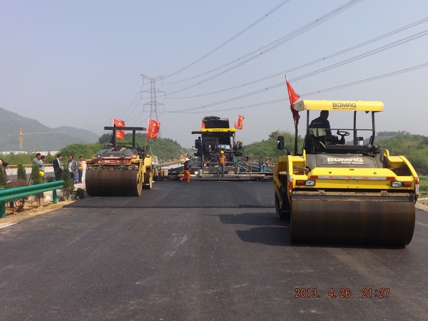 為保證此次試驗段攤鋪順利進行,項目部于4月25日晚召開專項會議,對各施工班組及機械操作人員進行詳細的技術、安全交底,對整個施工過程的各個環(huán)節(jié)進行了詳細確認,將責任、要求細化到個人。會議強調在施工過程中要嚴把質量關,瀝青出場溫度、到場溫度、攤鋪溫度、初壓溫度、復壓溫度、終壓溫度等相關指數(shù)均要在設計范圍內,同時,安全保障措施等也要控制到位。